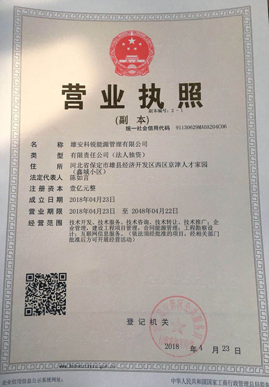 4月23日,北京科锐在雄安成立的全资子公司“雄安科锐能源管理有限公司”已完成工商注册登记,注册资本1亿,经营范围是以综合能源服务为主线,展开技术开发、服务、咨询、转让、推广以及合同能源管理、互联网信息服务等。