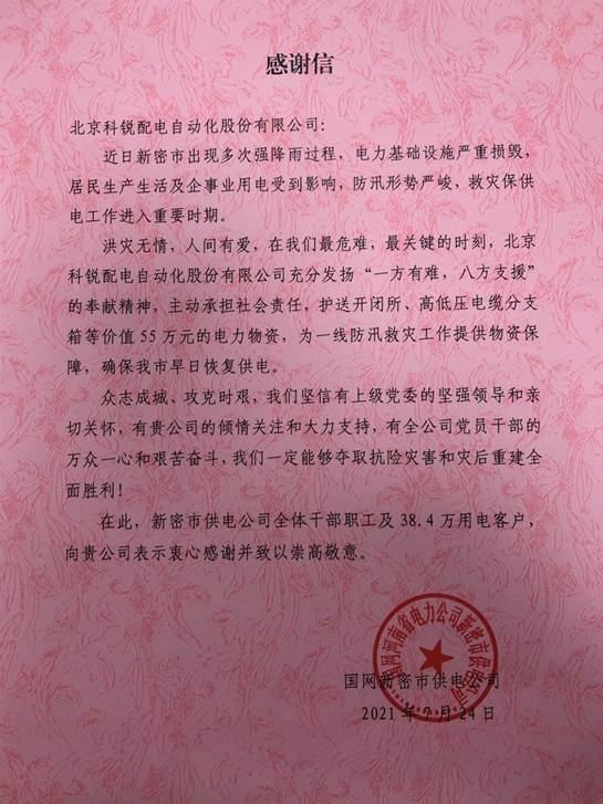 长期以来,北京科锐跟国家电网一直有着密切的合作。国家电网成就了北京科锐的发展壮大,北京科锐也在国家电网建设做出了应有的贡献。灾情面前,北京科锐挺身而出是义不容辞的社会责任担当,也是每一位科锐人的爱心奉献。